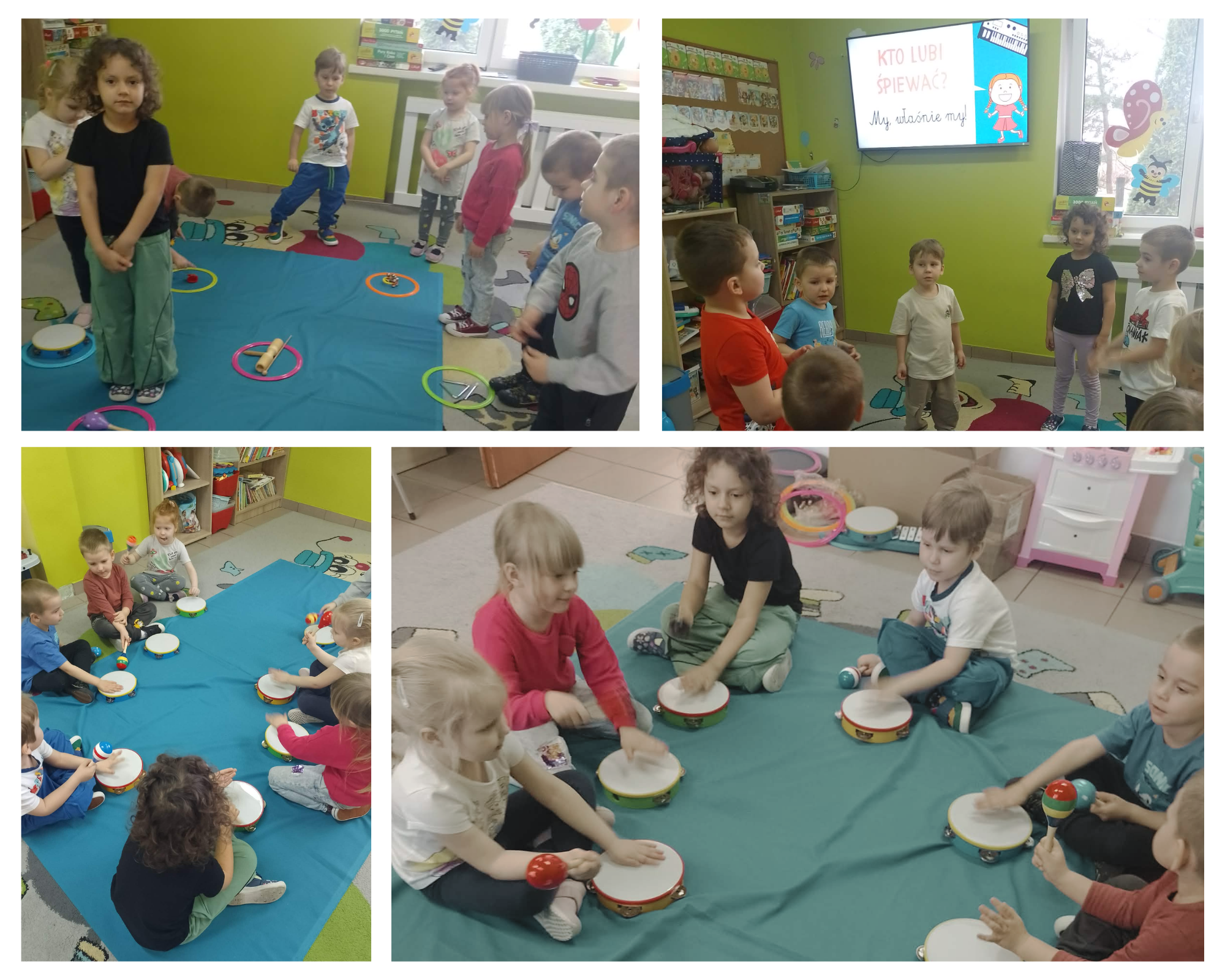 Dzieci z ogromnym zaangażowaniem uczestniczyły w zabawach rytmicznych, wykorzystując zakupione w ramach projektu instrumenty i pomoce, takie jak grzechotki, tamburyna oraz kolorowe chusty.